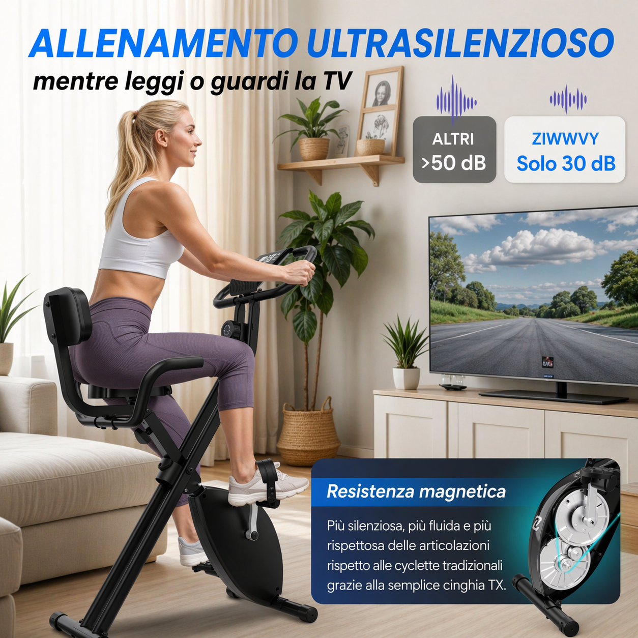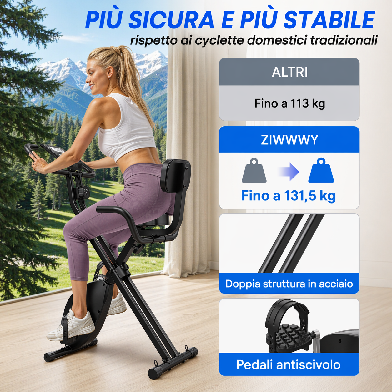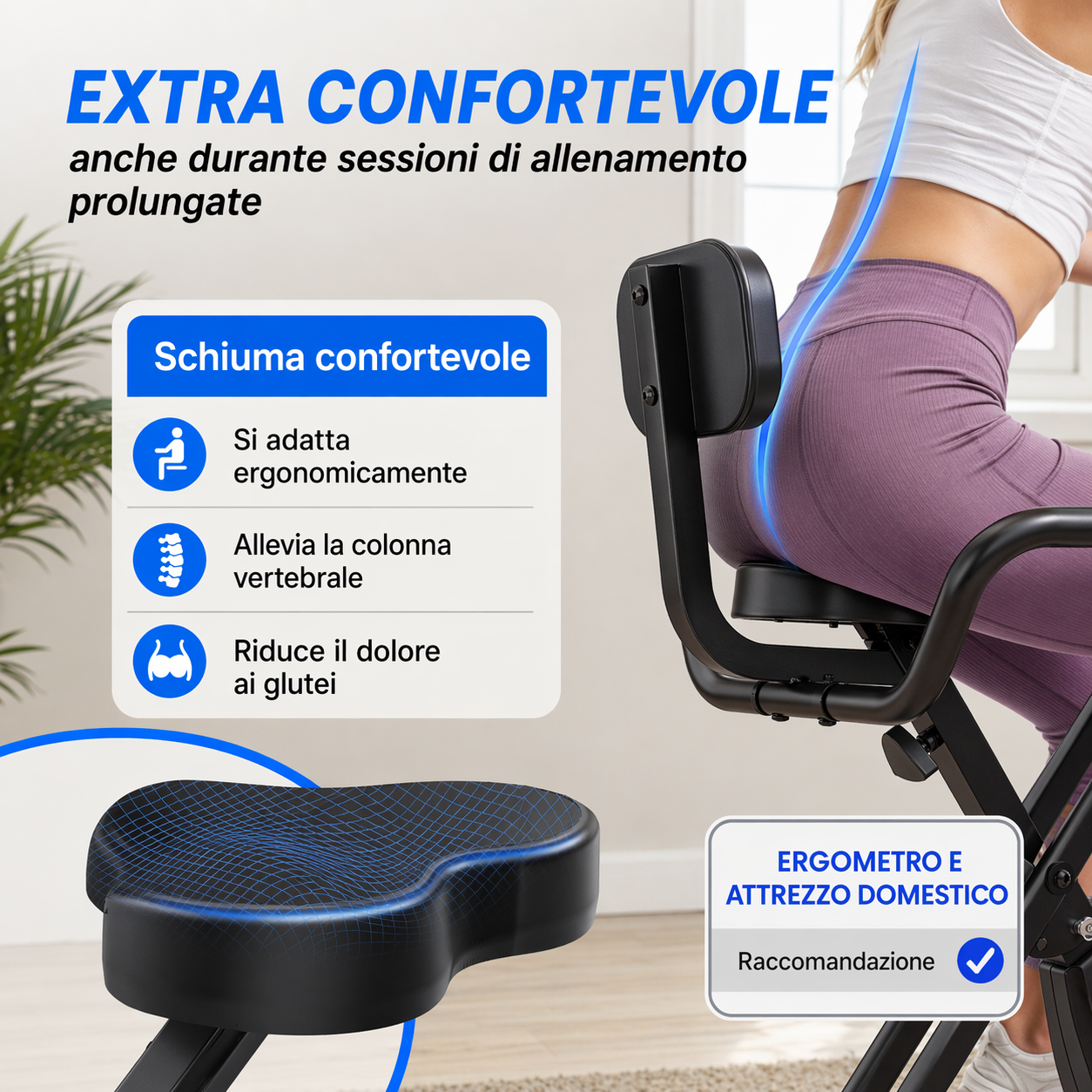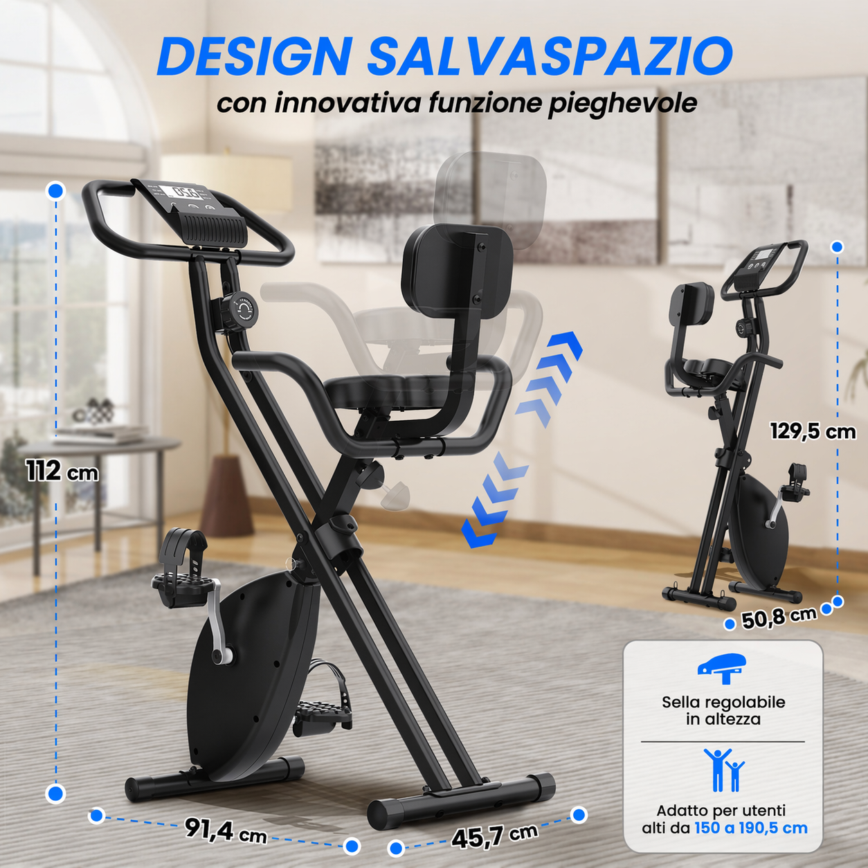 Per garantire un comfort ottimale, la cyclette è dotata di uno schienale pratico e comodo, progettato per sostenere la parte lombare senza eccessivo stress sulla schiena durante gli esercizi. Inoltre, la struttura richiudibile rende questa cyclette poco ingombrante e perfetta per ambienti con spazio limitato. Una volta concluso l’allenamento, il prodotto può essere richiuso completamente, riducendo al minimo l’ingombro e facilitando la sua conservazione.