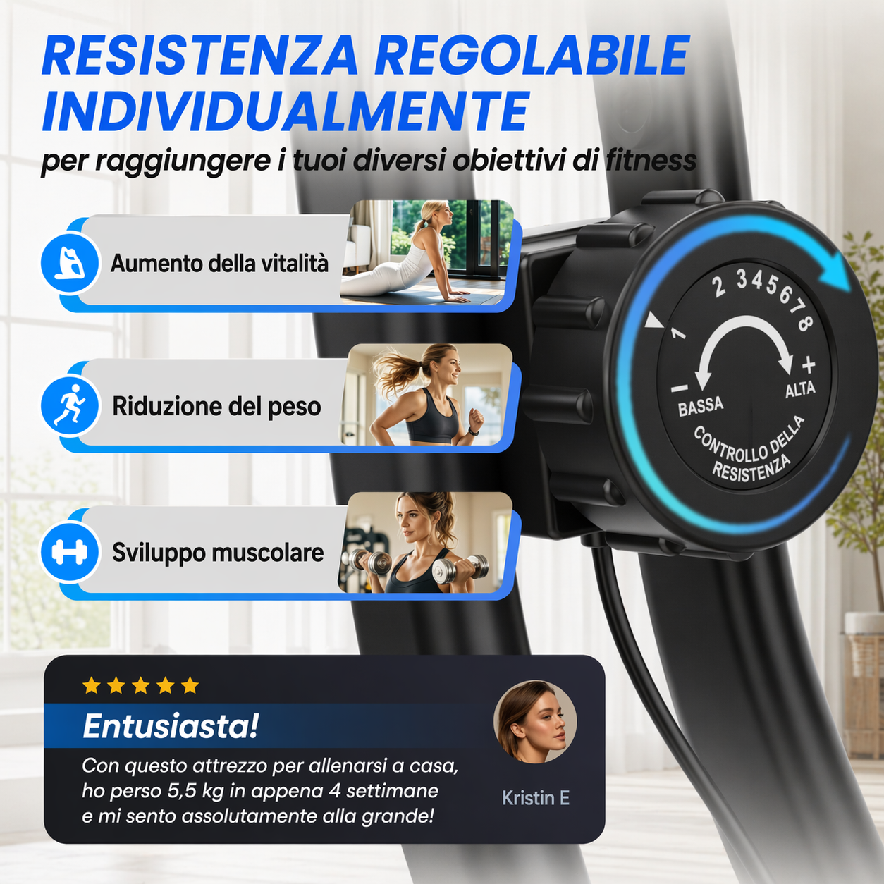 La fluidità e la scorrevolezza dell’allenamento sono garantite dalla massa volanica da 3 kg e dalla resistenza magnetica manuale. Con 8 livelli di sforzo regolabile tramite un’apposita manopola, gli utenti possono personalizzare la loro sessione di allenamento in base alle proprie esigenze e obiettivi di fitness. La cyclette consente di svolgere un allenamento cardio a basso impatto e ad alta intensità, rendendola ideale per l’uso domestico.